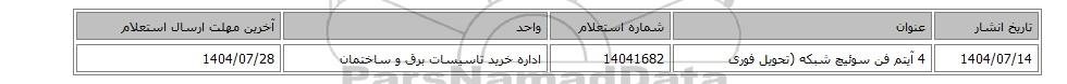 | 1404/07/14 | 4 آیتم فن سوئیچ شبکه (تحویل فوری | 14041682 | اداره خرید تاسیسات برق و ساختمان | 1404/07/28 |