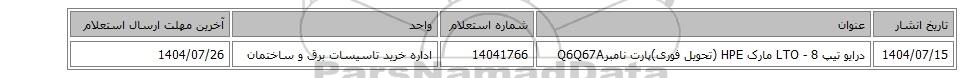| 1404/07/15 | درایو تیپ LTO - 8 مارک HPE (تحویل فوری)پارت نامبرQ6Q67A | 14041766 | اداره خرید تاسیسات برق و ساختمان | 1404/07/26 |