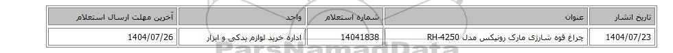 | 1404/07/23 | چراغ قوه شارژی مارک رونیکس مدل RH-4250 | 14041838 | اداره خرید لوازم یدکی و ابزار | 1404/07/26 |