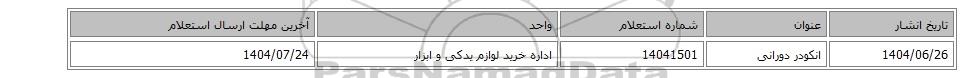 | 1404/06/26 | انکودر دورانی | 14041501 | اداره خرید لوازم یدکی و ابزار | 1404/07/24 |