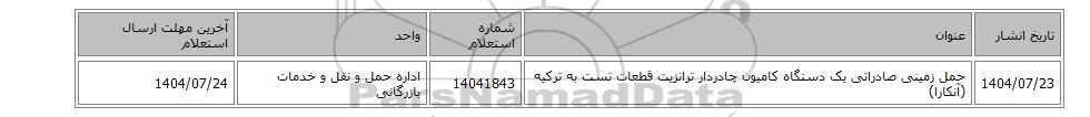 | 1404/07/23 | حمل زمینی صادراتی یک دستگاه کامیون چادردار ترانزیت قطعات تست به ترکیه (آنکارا) | 14041843 | اداره حمل و نقل و خدمات بازرگانی | 1404/07/24 |