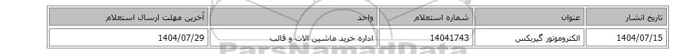 1404/07/15الکتروموتور گیربکس14041743اداره خرید ماشین الات و قالب1404/07/29