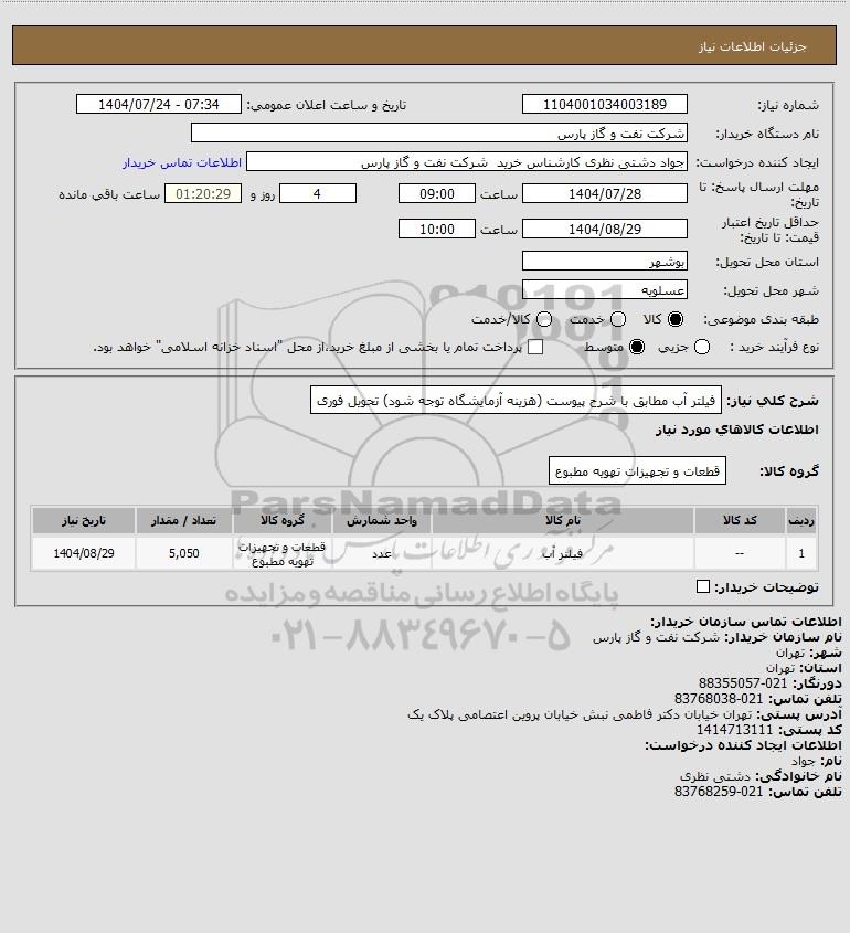 شرح کلی نیاز: فیلتر آب مطابق با شرح پیوست (هزینه آزمایشگاه توجه شود) تحویل فوری