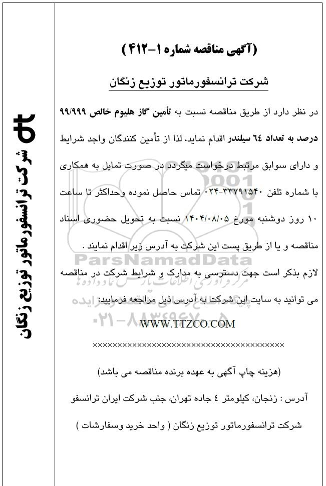 در نظر دارد از طریق مناقصه نسبت به تامین گاز هلیوم خالص 99.999 درصد به تعداد 64 سیلندر اقدام نماید. لذا از تأمین کنندگان واجد شرایط و دارای سوابق مرتبط درخواست می گردد در صورت تمایل به همکاری با شماره تلفن 33791540 - 024 تماس حاصل نموده و حداکثر تا ساعت 10 روز دوشنبه مورخ 1404.08.05 نسبت به تحویل حضوری اسناد مناقصه و یا از طریق پست این شرکت به آدرس زیر اقدام نمایند.