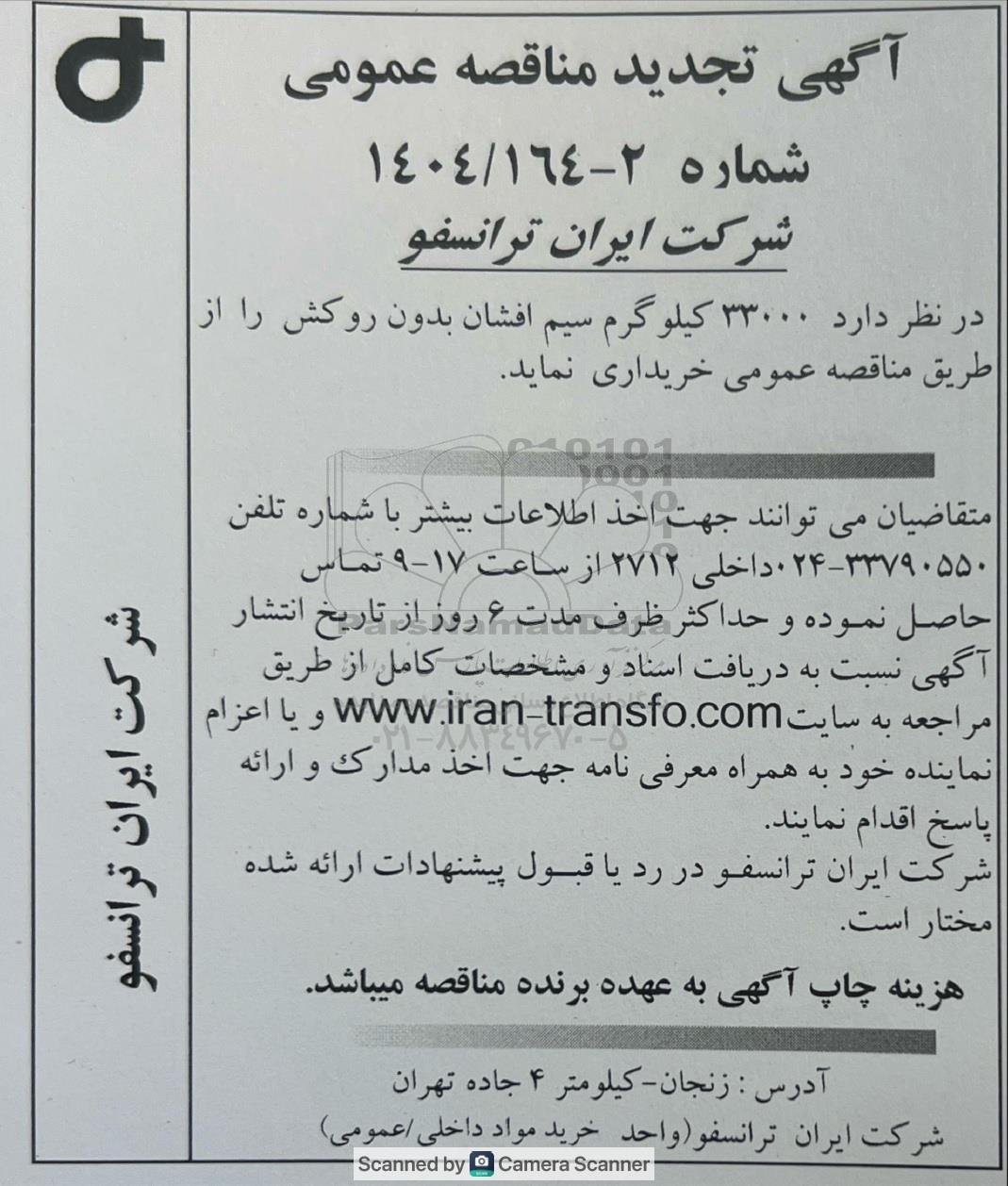 متقاضیان می توانند جهت اخذ اطلاعات بیشتر با شماره تلفن 33790550 - 024 داخلی 2712 از ساعت 17 - 9 تماس حاصل نموده و حداکثر ظرف مدت 6 روز از تاریخ انتشار آگهی نسبت به دریافت اسناد و مشخصات کامل از طریق مراجعه به سایت www.iran-transfo.com و یا اعزام نماینده خود به همراه معرفی نامه جهت اخذ مدارک و ارائه پاسخ اقدام نمایند.
