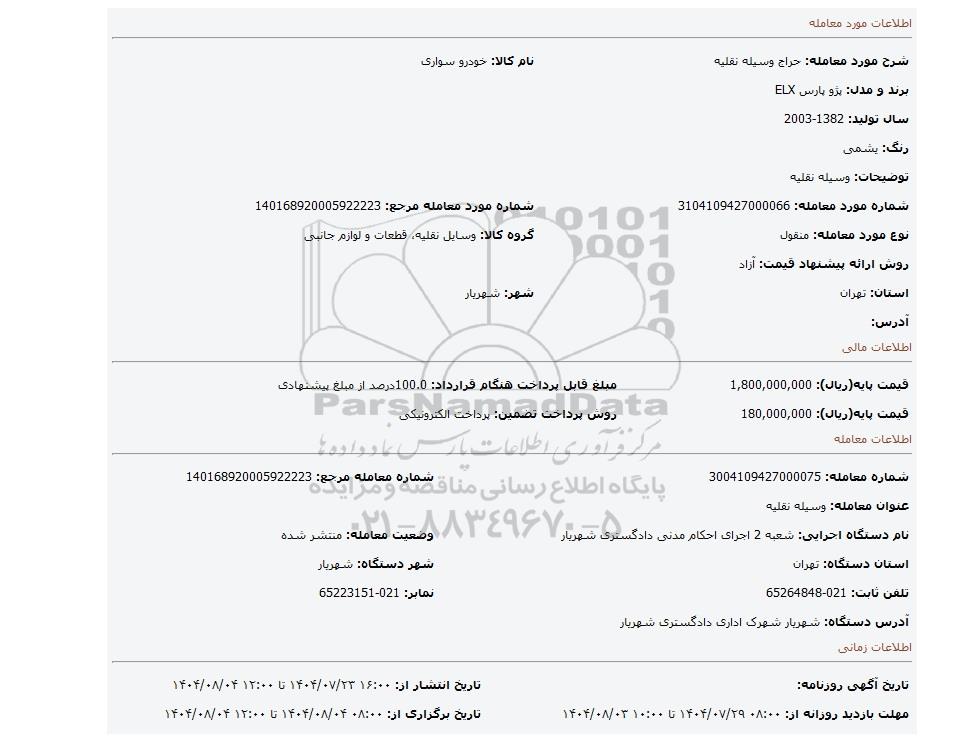 مزایده عمومی مزایده وسیله نقلیه برگزار میگردد. از کلیه افراد متخصص و شرکتهای واجد شرایط دعوت به عمل میآید تا در این مزایده با کد خبرگزاری پارس نماد : 9707420 شرکت نمایند تاریخ شروع مزایده : 1404/07/23 مهلت شرکت در مزایده: تا پایان روز 1404/08/04