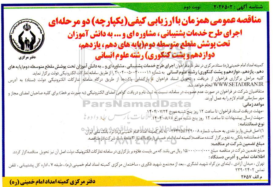 کمیته امداد امام خمینی (ره) ستاد مرکزی در نظر دارد فراخوان اجرای طرح خدمات پشتیبانی ، مشاوره ای و ... به دانش آموزان تحت پوشش مقطع متوسطه دوم (پایه های دهم، یازدهم، دوازدهم و پشت کنکوری) رشته علوم انسانی به شماره 2004005003000011 را از طریق سامانه تدارکات الکترونیکی دولت برگزار نماید. کلیه مراحل برگزاری فراخوان از دریافت و تحویل اسناد فراخوان تا بازگشایی پاکتها از طریق درگاه سامانه تدارکات الکترونیکی دولت (ستاد) به آدرس ستاد ایران انجام خواهد شد. متقاضیان شرکت در فراخوان در صورت عدم عضویت در سامانه نسبت به ثبت نام و دریافت گواهی امضای الکترونیکی به صورت برخط برای کلیه صاحبان امضای مجاز و مهر سازمانی اقدام لازم را به عمل آورند.