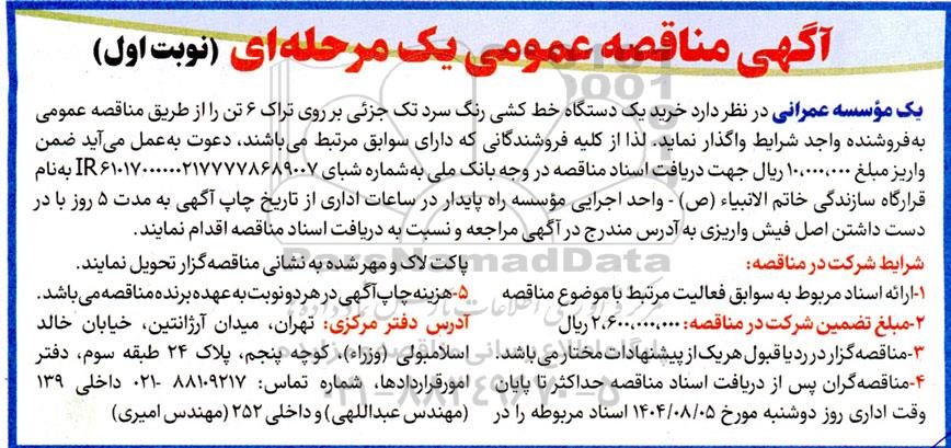 یک موسسه عمرانی در نظر دارد خرید یک دستگاه خط کشی رنگ سرد تک جزئی بر روی تراک 6 تن را از طریق مناقصه عمومی به فروشنده واجد شرایط واگذار نماید. لذا از کلیه فروشندگانی که دارای سوابق مرتبط میباشند دعوت به عمل می آید ضمن واریز مبلغ 10.000.000 ریال جهت دریافت اسناد مناقصه در وجه بانک ملی به شماره شباء 610170000002177778689007 IR بنام قرارگاه سازندگی خاتم الانبیاء (ص) - واحد اجرایی موسسه راه پایدار در ساعات اداری از تاریخ چاپ آگهی به مدت 5 روز با در دست داشتن اصل فیش واریزی به آدرس مندرج در آگهی مراجعه و نسبت به دریافت اسناد مناقصه اقدام نمایند.