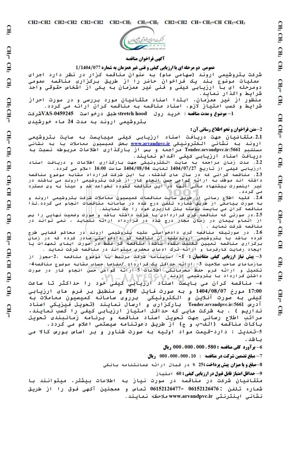 متقاضیان شرکت در مناقصه در صورت نیاز به اطلاعات بیشتر، می توانند با شماره تلفن :06152126476 - 06152126477 تماس و همچنین آگهی فوق را از طریق نشانی اینترنتی www.arvandpvc.ir ملاحظه نمایند.