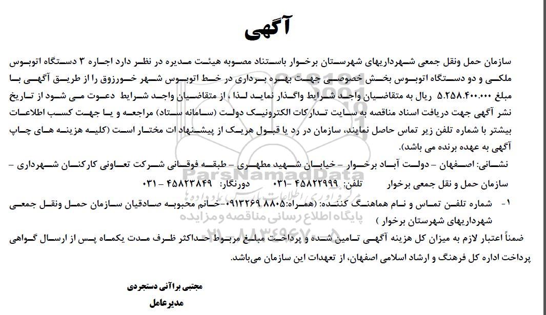 سازمان حمل و نقل جمعی شهرداریهای شهرستان برخوار باستناد مصوبه هیئت مدیره در نظر دارد اجاره 3 دستگاه اتوبوس ملکی و دو دستگاه اتوبوس بخش خصوصی جهت بهره برداری در خط اتوبوس شهر خورزوق را از طریق آگهی با مبلغ 5.258.400.000 ریال به متقاضیان واجد شرایط واگذار نماید لذا از متقاضیان واجد شرایط دعوت می شود از تاریخ نشر آگهی جهت دریافت اسناد مناقصه به سایت تدارکات الکترونیک دولت سامانه ستاد مراجعه و یا جهت کسب اطلاعات بیشتر با شماره تلفن زیر تماس حاصل نمایند سازمان در رد یا قبول هر یک از پیشنهادات مختار است کلیه هزینه های چاپ آگهی به عهده برنده می باشد.