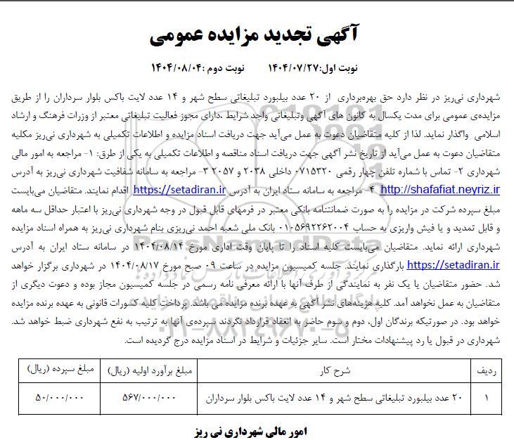 شهرداری نی ریز در نظر دارد حق بهره برداری از 20 عدد بیلبورد تبلیغاتی سطح شهر و 14 عدد لایت باکس بلوار سرداران را از طریق مزایده ی عمومی برای مدت یکسال به کانون های آگهی و تبلیغاتی واجد شرایط دارای مجوز فعالیت تبلیغاتی معتبر از وزرات فرهنگ و ارشاد اسلامی واگذار نماید لذا از کلیه متقاضیان دعوت به عمل میآید جهت دریافت اسناد مزایده و اطلاعات تکمیلی به شهرداری نی ریز مکلیه متقاضیان دعوت به عمل می آید از تاریخ نشر آگهی جهت دریافت اسناد مناقصه و اطلاعات تکمیلی به یکی از طرق -1- مراجعه به امور مالی شهرداری 2- تماس با شماره تلفن چهار رقمی 0715320 داخلی 2038 و2057 3- مراجعه به سامانه شفافیت شهرداری نی ریز به آدرسhttp://shafafiat.neyriz.ir - مراجعه به سامانه ستاد ایران به آدرس سایت ستاد ایران اقدام نمایند. متقاضیان می بایست مبلغ سپرده شرکت در مزایده را به صورت ضمانتنامه بانکی معتبر در فرمهای قابل قبول در وجه شهرداری نی ریز با اعتبار حداقل سه ماهه و قابل تمدید و یا فیش واریزی به حساب 0105692262004 بانک ملی شعبه احمد نیریزی بنام شهرداری نی ریز به همراه اسناد مزایده شهرداری ارائه نماید متقاضیان میبایست کلیه اسناد را تا پایان وقت اداری مورخ 1404.07.16 در سامانه ستاد ایران به آدرس سایت ستاد ایران بارگذاری نمایند جلسه کمیسیون مزایده در ساعت 09 صبح مورخ 1404.08.17 در شهرداری برگزار خواهد شد. حضور متقاضیان یا یک نفر به نمایندگی از طرف آنها با ارائه معرفی نامه رسمی در جلسه کمیسیون مجاز بوده و دعوت دیگری از متقاضیان به عمل نخواهد آمد کلیه هزینه های نشر آگهی به عهده برنده مزایده میباشد پرداخت کلیه کسورات قانونی به عهده برنده مزایده خواهد بود. در صورتیکه برندگان اول دوم و سوم حاضر به انعقاد قرارداد نگردند سپرده ی آنها به ترتیب به نفع شهرداری ضبط خواهد شد. شهرداری در قبول یا رد پیشنهادات مختار است. سایر جزئیات و شرایط در اسناد مزایده درج گردیده است.