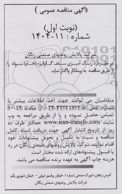 www.iran-transfo.com حداکثر ظرف ده روز از تاریخ انتشار آگهی جهت دریافت اسناد کامل مناقصه و نسبت به تکمیل و تحویل پیشنهادات خود اقدام نمایند. شرکت پالایش روغنهای صنعتی زنگان در رد یا قبول پیشنهادهای ارائه شده مختار است.