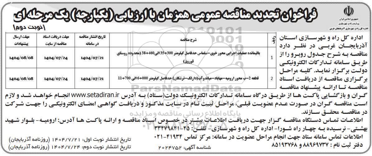 2 | قطعه 2- ب محور ارومیه- مهاباد- میاندوآب (دارلک- ترشکان) حد فاصل کیلومتر 000+6 الی 700+11 | 1404.07.21 | 1404.07.24 | 1404.08.08 |