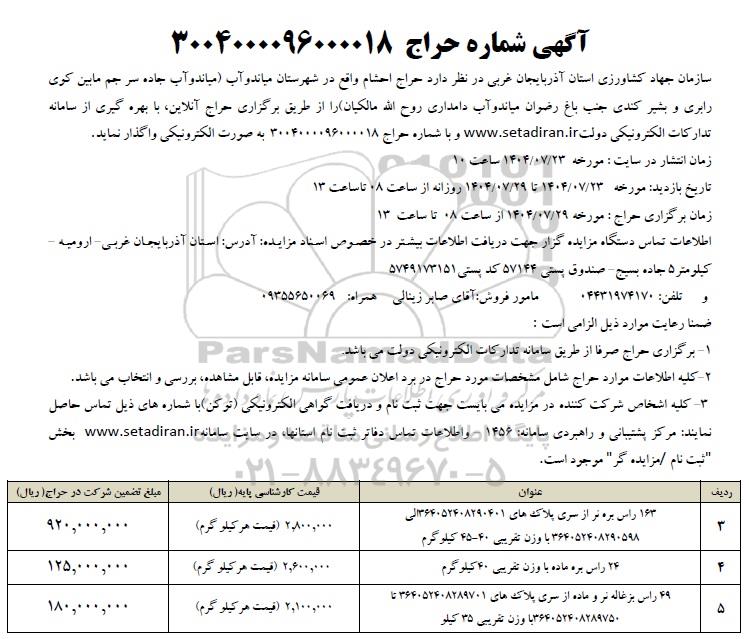 سازمان جهاد کشاورزی استان آذربایجان غربی در نظر دارد حراج احشام واقع در شهرستان میاندوآب (میاندوآب جاده سر جم مابین کوی رابری و بشیر کندی جنب باغ رضوان میاندوآب دامداری روح الله مالکیان) را از طریق برگزاری حراج آنلاین، با بهره گیری از سامانه تدارکات الکترونیکی دولت و با شماره حراج 3004000096000018 به صورت الکترونیکی واگذار نماید.