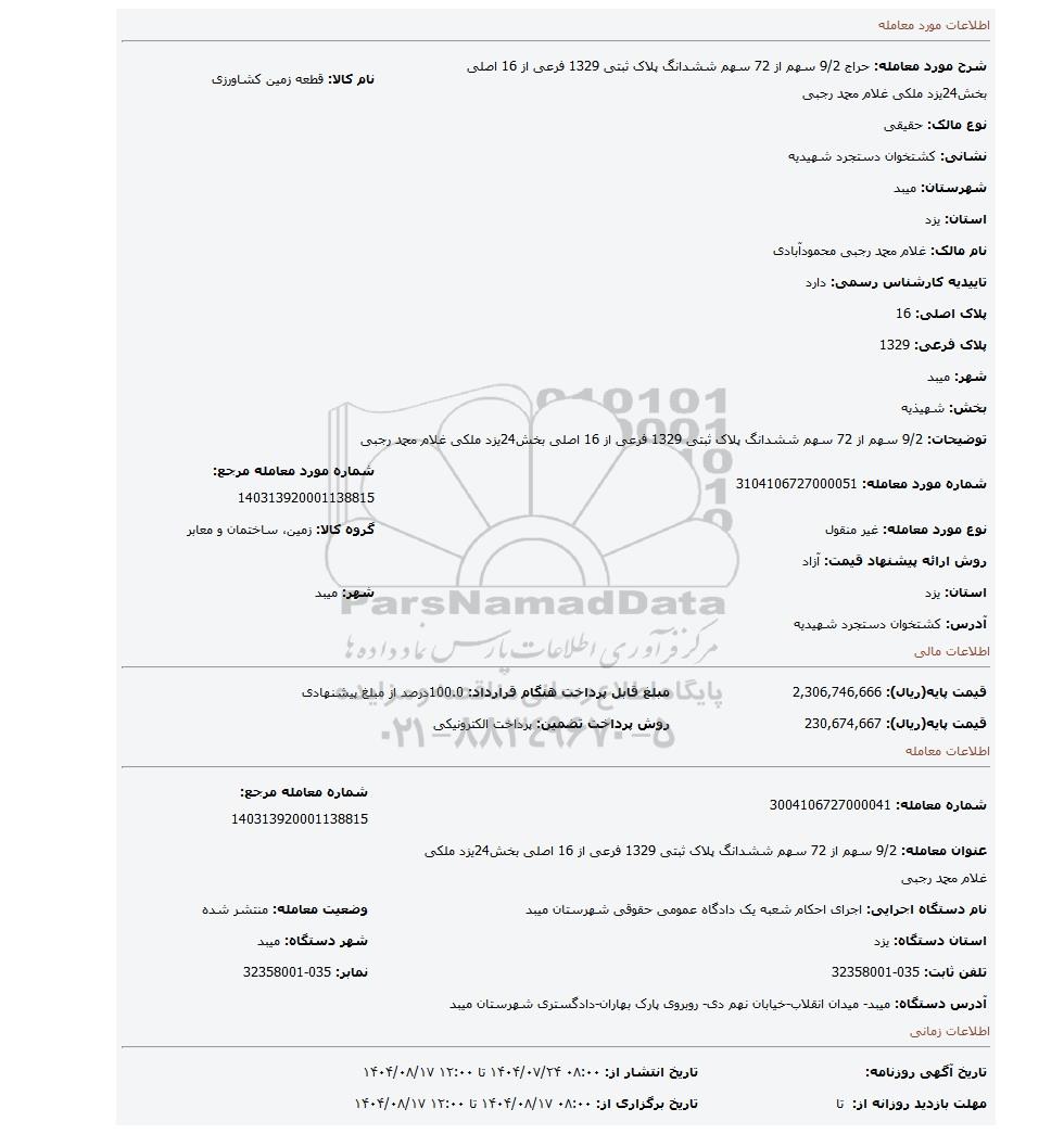 | شرح مورد معامله: حراج 9/2 سهم از 72 سهم ششدانگ پلاک ثبتی 1329 فرعی از 16 اصلی بخش24یزد ملکی غلام محمد رجبی | نام کالا: قطعه زمین کشاورزی | |