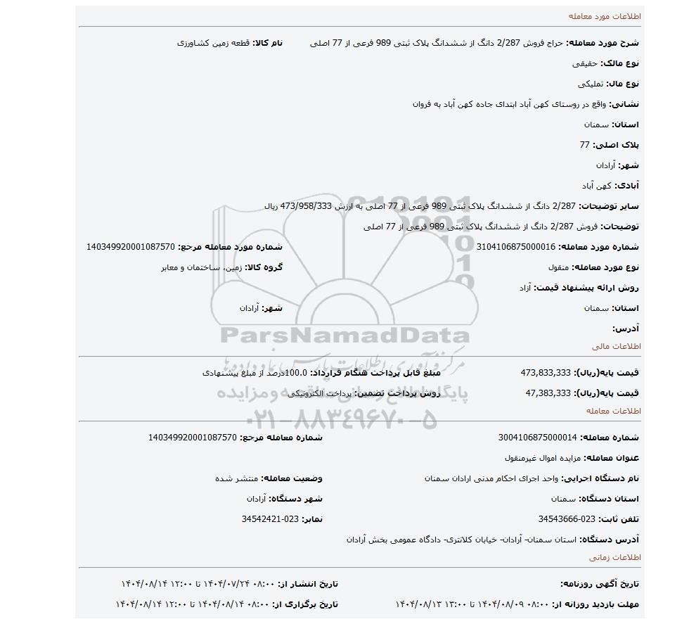 | شرح مورد معامله: حراج فروش 2/287 دانگ از ششدانگ پلاک ثبتی 989 فرعی از 77 اصلی | نام کالا: قطعه زمین کشاورزی | |