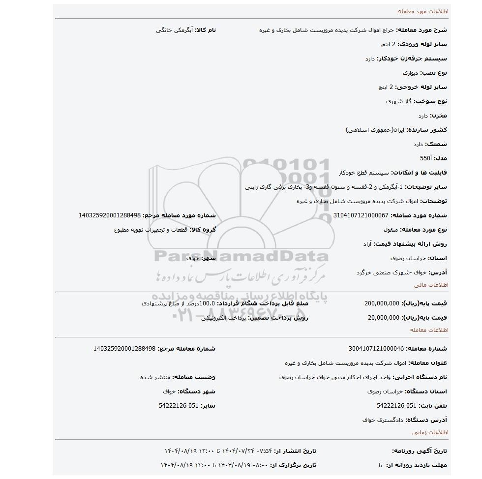 | عنوان معامله: اموال شرکت پدیده مروزیست شامل بخاری و غیره | ||