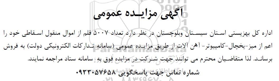 اداره کل بهزیستی استان سیستان و بلوچستان در نظر دارد تعداد 5007 قلم از اموال منقول اسقاطی خود را اعم از میز - یخچال - کامپیوتر - آهن آلات از طریق مزایده عمومی (سامانه تدارکات الکترونیکی دولت) به فروش برساند. لذا متقاضیان محترم میتوانند جهت شرکت در مزایده فوق به سامانه ستاد مراجعه نمایند.