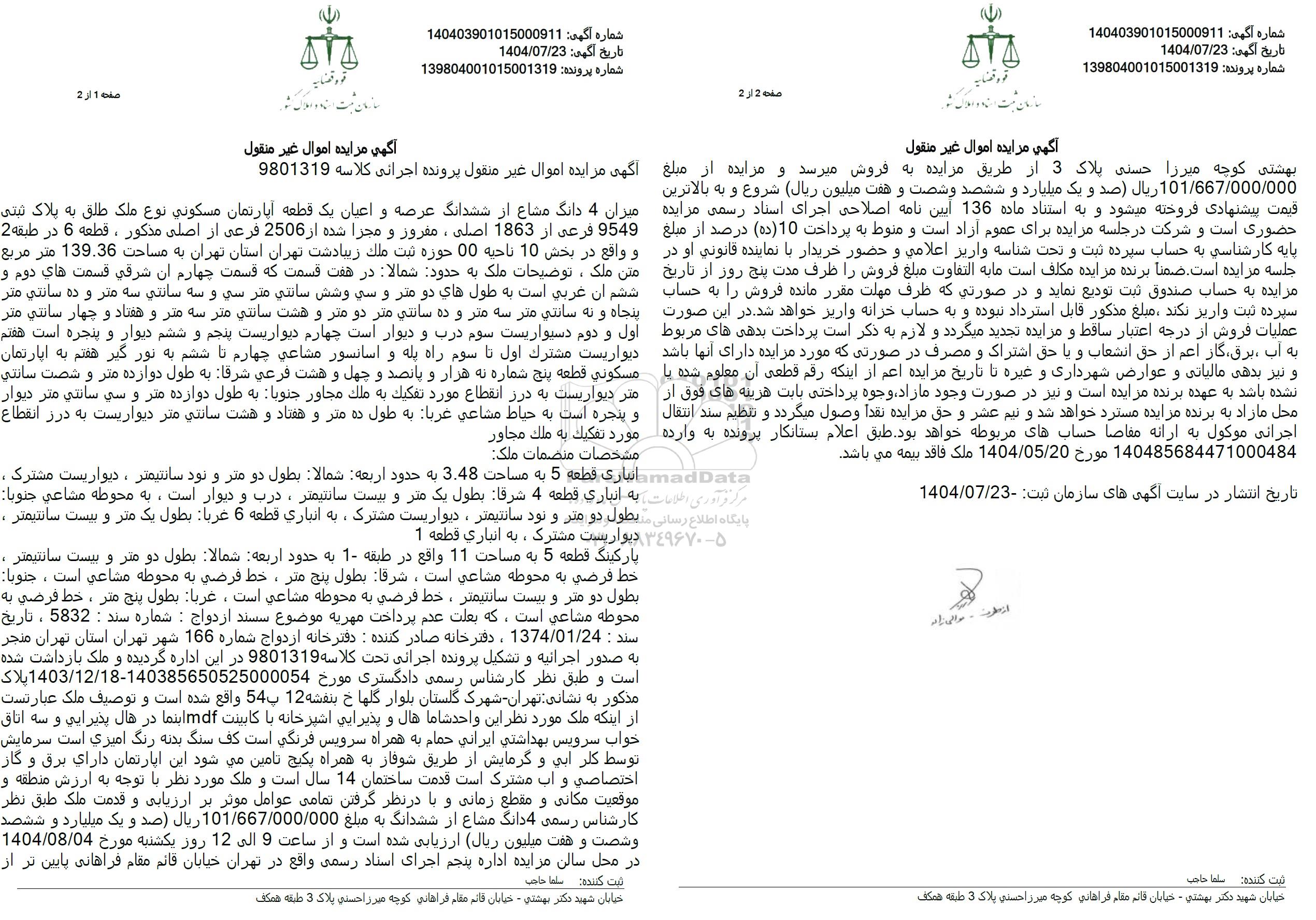 آگهی مزایده اموال غیر منقول پرونده اجرائی کلاسه 9801319