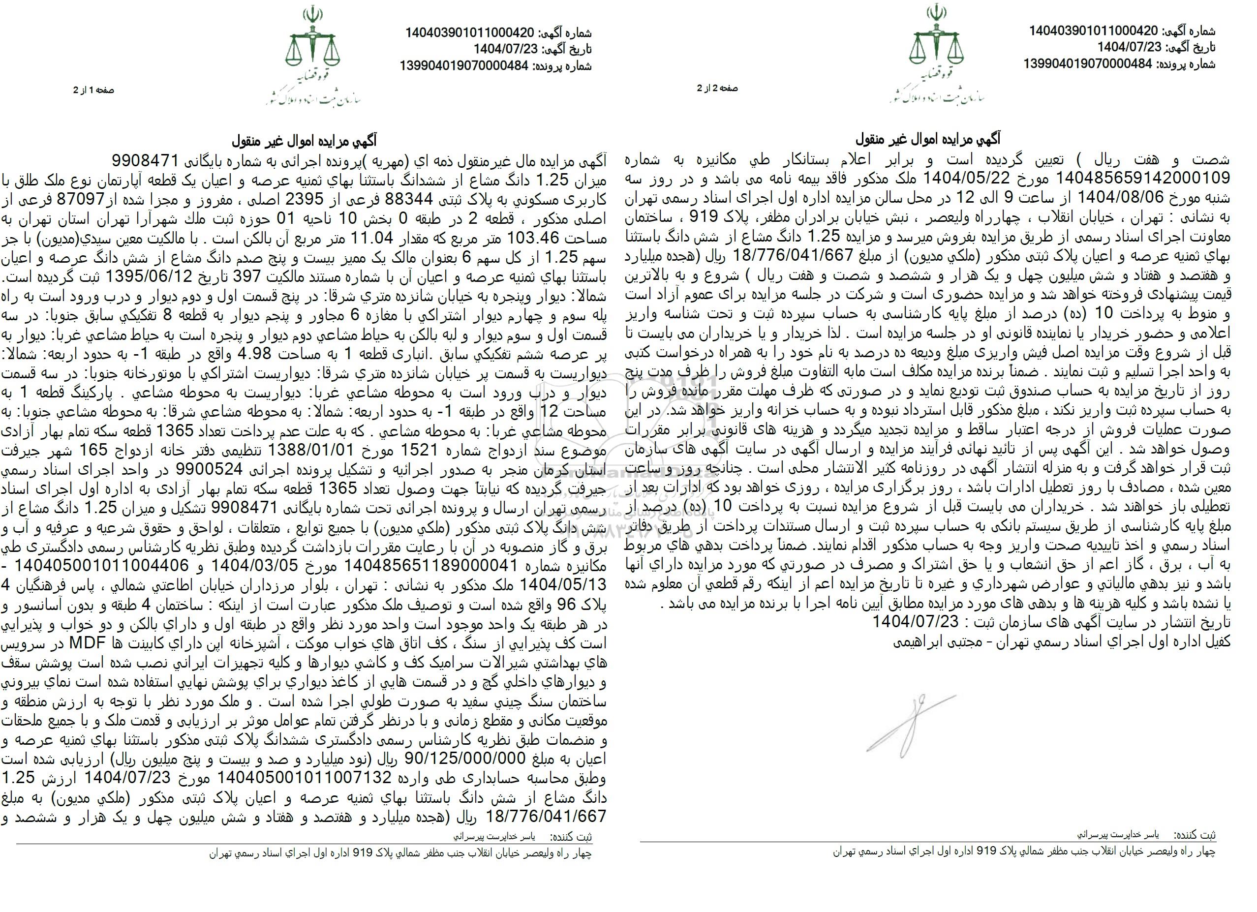 آگهی مزایده مال غیر منقول ذمه اي مهریه) ( پرونده اجرانی به شماره بایگانی 9908471 میزان 1.25 دانگ مشاع از ششدانگ باستثنا بهاي ثمنيه عرصه و اعیان یک قطعه آپارتمان نوع ملک طلق با کاربری مسکونی به پلاک ثبتی 88344 فرعی از 2395 اصلی ، مفروز و مجزا شده از 87097 فرعی از اصلی مذکور ، قطعه 2 در طبقه 0 بخش 10 ناحيه 01 حوزه ثبت ملک شهر ارا تهران استان تهران به مساحت 103.46 متر مربع که مقدار 11.04 متر مربع آن بالکن است. با مالکیت معین سيدی (مديون) با جز سهم 1.25 از کل سهم 6 بعنوان مالک یک ممیز بیست و پنج صدم دانگ مشاع از شش دانگ عرصه و اعیان باستثنا بهاي ثمنيه عرصه و اعیان آن با شماره مستند مالکیت 397 تاريخ 1395.06.12 ثبت گردیده است. شمالا دیوار و پنجره به خیابان شانزده متری شرقا در پنج قسمت اول و دوم دیوار و درب ورود است به راه پله سوم و چهارم دیوار اشتراکی با مغازه 6 مجاور و پنجم دیوار به قطعه 8 تفكيكي سابق جنوبا در سه قسمت اول و سوم دیوار و لبه بالکن به حیاط مشاعي دوم دیوار و پنجره است به حیاط مشاعي غربا دیوار به پر عرصه ششم تفكيكي سابق انباری قطعه 1 به مساحت 4.98 واقع در طبقه -1 به حدود اربعه شمالا دیواریست به قسمت پر خیابان شانزده متری شرقا دیواریست اشتراکی با موتورخانه جنوبا در سه قسمت دیوار و درب ورود است به محوطه مشاعي غربا دیواریست به محوطه مشاعي . پارکینگ قطعه 1 به مساحت 12 واقع در طبقه -1 به حدود اربعه شمالا به محوطه مشاعي شرقا به محوطه مشاعي جنوبا به محوطه مشاعي غربا به محوطه مشاعی . که به علت عدم پرداخت تعداد 1365 قطعه سکه تمام بهار آزادی موضوع سند ازدواج شماره 1521 مورخ 1388.01.01 تنظیمی دفتر خانه ازدواج 165 شهر جیرفت استان کرمان منجر به صدور اجرائیه و تشکیل پرونده اجرائی 9900524 در واحد اجرای استاد رسمي جیرفت گردیده که نیابتا جهت وصول تعداد 1365 قطعه سکه تمام بهار آزادی به اداره اول اجرای اسناد رسمی تهران ارسال و پرونده اجرائی تحت شماره بایگانی 9908471 تشکیل و میزان 1.25 دانگ مشاع از شش دانگ پلاک ثبتیى مذكور ملكي مديون با جميع توابع ، متعلقات ، لواحق و حقوق شرعیه و عرفیه و آب و برق و گاز منصوبه در آن با رعایت مقررات بازداشت گردیده و طبق نظریه کارشناس رسمی دادگستری طی - 140405001011004406 مکانیزه شماره 140485651189000041 مورخ 1404.03.05 و 1404.05.13 ملک مذکور به نشانی : تهران ، بلوار مرزداران خیابان اطاعتي شمالي ، پاس فرهنگیان 4 پلاک 96 واقع شده است و توصیف ملک مذکور عبارت است از اینکه : ساختمان 4 طبقه و بدون آسانسور و در هر طبقه یک واحد موجود است واحد مورد نظر واقع در طبقه اول و دارای بالکن و دو خواب و پذیرایی است کف پذیرایی از سنگ ، کف اتاق هاي خواب موکت ، آشپزخانه اين داراي کابينتها MDF در سرویس هاي بهداشتي شیرالات سرامیک کف و کاشی دیوارها و کلیه تجهیزات ایرانی نصب شده است پوشش سقف و دیوارهای داخلی گچ و در قسمتهایی از کاغذ ديواري براي پوشش نهایی استفاده شده است نماي بيروني ساختمان سنگ چینی سفید به صورت طولی اجرا شده است. و ملک مورد نظر با توجه به ارزش منطقه و موقعیت مکانی و مقطع زمانی و با در نظر گرفتن تمام عوامل موثر بر ارزیابی و قدمت ملک و با جميع ملحقات و منضمات طبق نظریه کارشناس رسمی دادگستری ششدانگ پلاک ثبتى مذكور باستثنا بهاي ثمنيه عرصه و اعیان به مبلغ 90.125.000.000 ريال نود میلیارد و صد و بیست و پنج میلیون (ریال) ارزیابی شده است. و طبق محاسبه حسابداری طی وارده 140405001011007132 مورخ 1404.07.23 ارزش 1.25 دانگ مشاع از شش دانگ باستثنا بهاي ثمنيه عرصه و اعیان پلاک ثبتی مذکور ملكي مديون به مبلغ 18.776.041.667 ریال هجده میلیارد و هفتصد و هفتاد و شش میلیون چهل و یک هزار و ششصد و شصت و هفت ریال ) تعیین گردیده است و برابر اعلام بستانکار طي مکانیزه به شماره 140485659142000109 مورخ 1404.05.22 ملک مذکور فاقد بیمه نامه میباشد و در روز سه شنبه مورخ 1404.08.06 از ساعت 9 الی 12 در محل سالن مزایده اداره اول اجرای اسناد رسمی تهران به نشانی: تهران ، خیابان انقلاب ، چهار راه ولیعصر ، نبش خیابان برادران ،مظفر پلاک 919 ، ساختمان معاونت اجرای اسناد ر