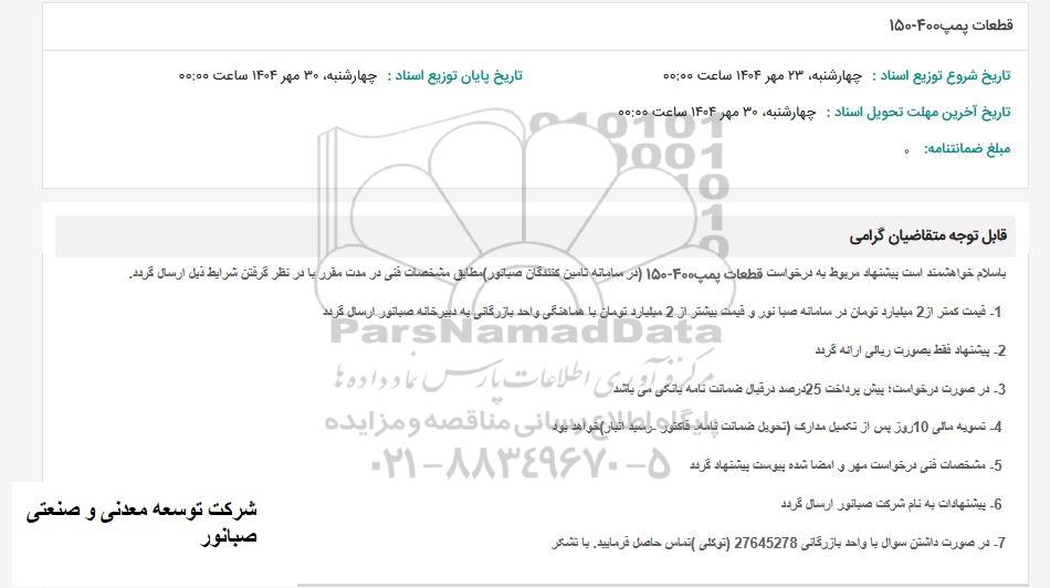 باسلام خواهشمند است پیشنهاد مربوط به درخواست قطعات پمپ 400-150 در (سامانه تامین کنندگان صبانور) مطابق مشخصات فنی در مدت مقرر با در نظر گرفتن شرایط ذیل ارسال گردد.