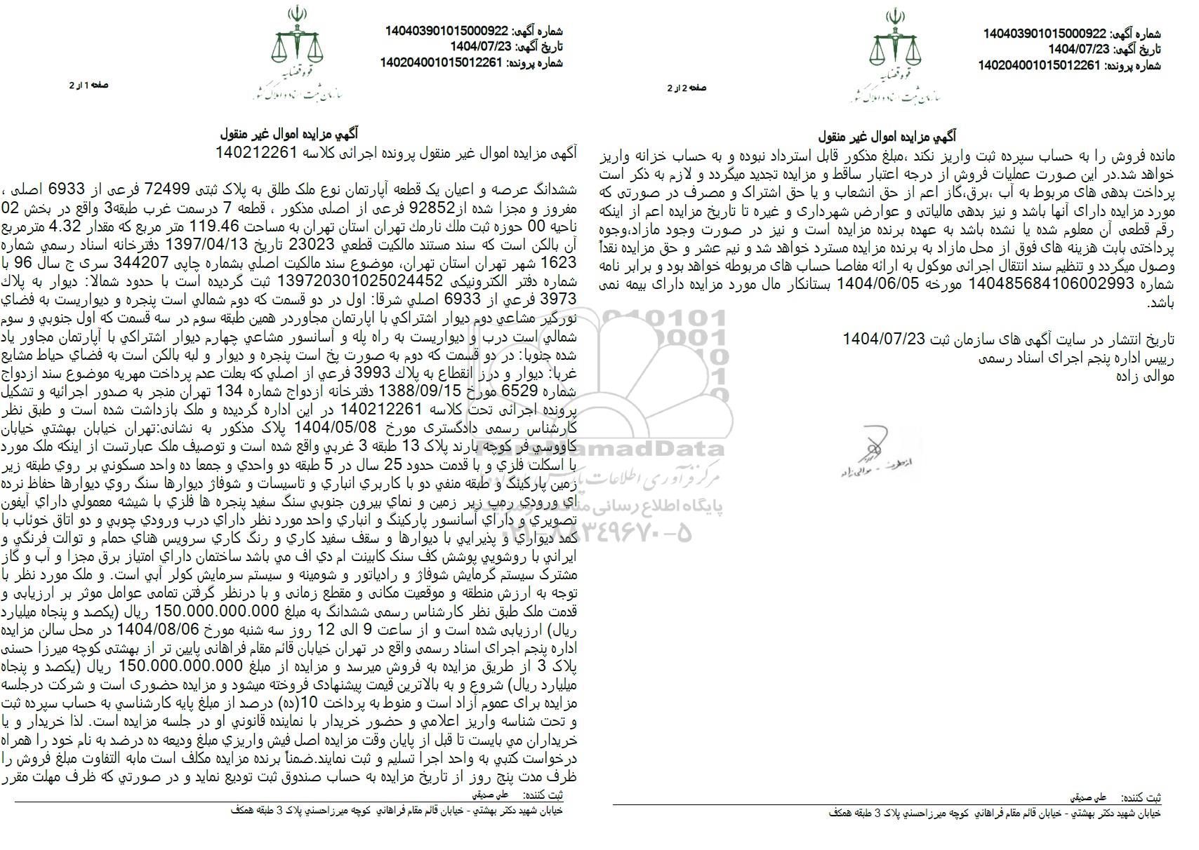 ششدانگ عرصه و اعیان یک قطعه آپارتمان نوع ملک طلق به پلاک ثبتی 72499 فرعی از 6933 اصلی ، مفروز و مجزا شده از 92852 فرعی از اصلی مذکور، قطعه 7 در سمت غرب طبقه 3 واقع در بخش 02 ناحيه 00 حوزه ثبت ملک نارمک تهران استان تهران به مساحت 119.46 متر مربع که مقدار 4.32 متر مربع آن بالکن است که سند مستند مالكيت قطعي 23023 تاریخ 1397.04.13 دفترخانه اسناد رسمی شماره 1623 شهر تهران استان تهران موضوع سند مالكيت اصلي بشماره چاپی 344207 سری ج سال 96 با شماره دفتر الکترونیکی 139720301025024452 ثبت گردیده است با حدود شمالا دیوار به پلاک 3973 فرعي از 6933 اصلي شرقا اول در دو قسمت که دوم شمالی است پنجره و دیواریست به فضاي نورگیر مشاعي دوم دیوار اشتراکی با اپارتمان مجاور در همین طبقه سوم در سه قسمت که اول جنوبی و سوم شمالی است درب و دیواریست به راه پله و آسانسور مشاعی چهارم دیوار اشتراکی با آپارتمان مجاور یاد شده جنوبا در دو قسمت که دوم به صورت یخ است پنجره و دیوار و لبه بالکن است به فضای حیاط مشابع غربا دیوار و درز انقطاع به پلاك 3993 فرعی از اصلی که بعلت عدم پرداخت مهریه موضوع سند ازدواج شماره 6529 مورخ 1388.09.15 دفترخانه ازدواج شماره 134 تهران منجر به صدور اجرائیه و تشکیل پرونده اجرائی تحت کلاسه 140212261 در این اداره گردیده و ملک بازداشت شده است و طبق نظر کارشناس رسمی دادگستری مورخ 1404.05.08 پلاک مذکور به نشانی تهران خیابان بهشتی خیابان کاووسی فر کوچه بارند پلاک 13 طبقه 3 غربی واقع شده است و توصیف ملک عبارتست از اینکه ملک مورد با اسکلت فلزی و با قدمت حدود 25 سال در 5 طبقه دو واحدي و جمعا ده واحد مسكوني بر روي طبقه زیر زمین پارکینگ و طبقه منفی دو با کاربری انباری و تاسیسات و شوفاژ دیوارها سنگ روی دیوارها حفاظ نرده اي ورودي رمپ زیر زمین و نمای بیرون جنوبی سنگ سفید پنجره ها فلزي با شیشه معمولي داراي ايفون تصويري و داراي آسانسور پارکینگ و انباری واحد مورد نظر داراي درب ورودي چوبي و دو اتاق خوناب با کمد ديواري و پذیرایی با دیوارها و سقف سفید کاری و رنگ کاري سرويس هناي حمام و توالت فرنگي و ایرانی با روشویی پوشش کف سنگ کابینت ام دي اف می باشد ساختمان دارای امتیاز برق مجزا و آب و گاز مشترک سیستم گرمایش شوفاژ و رادیاتور و شومینه و سیستم سرمایش کولر آبی است و ملک مورد نظر با توجه به ارزش منطقه و موقعیت مکانی و مقطع زمانی و با در نظر گرفتن تمامی عوامل موثر بر ارزیابی و قدمت ملک طبق نظر کارشناس رسمی ششدانگ به مبلغ 150.000.000.000 ريال یکصد و پنجاه میلیارد ریال ارزیابی شده است و از ساعت 9 الی 12 روز سه شنبه مورخ 1404.08.06 در محل سالن مزایده اداره پنجم اجرای اسناد رسمی واقع در تهران خیابان قائم مقام فراهانی پایین تر از بهشتی کوچه میرزا حسنی پلاک 3 از طریق مزایده به فروش میرسد و مزایده از مبلغ 150.000.000.000 ریال یکصد و پنجاه میلیارد ریال شروع و به بالاترین قیمت پیشنهادی فروخته میشود و مزایده حضوری است و شرکت در جلسه مزایده برای عموم آزاد است و منوط به پرداخت (10 ده درصد از مبلغ پایه کارشناسی به حساب سپرده ثبت و تحت شناسه واریز اعلامی و حضور خریدار با نماینده قانونی او در جلسه مزایده است. لذا خریدار و یا خریداران می بایست تا قبل از پایان وقت مزایده اصل فیش واريزي مبلغ ودیعه ده درصد به نام خود را همراه درخواست کتبی به واحد اجرا تسلیم و ثبت نمایند. ضمناً برنده مزایده مکلف است ما به التفاوت مبلغ فروش را ظرف مدت پنج روز از تاریخ مزایده به حساب صندوق ثبت تودیع نماید و در صورتی که ظرف مهلت مقرر  مانده فروش را به حساب سپرده ثبت واریز نکند مبلغ مذکور قابل استرداد نبوده و به حساب خزانه واریز خواهد شد. در این صورت عملیات فروش از درجه اعتبار ساقط و مزایده تجدید میگردد و لازم به ذکر است پرداخت بدهی های مربوط به آب برق گاز اعم از حق انشعاب و یا حق اشتراک و مصرف در صورتی که مورد مزایده دارای آنها باشد و نیز بدهی مالیاتی و عوارض شهرداری و غیره تا تاریخ مزایده اعم از اینکه رقم قطعی آن معلوم شده یا نشده باشد به عهده برنده مزای