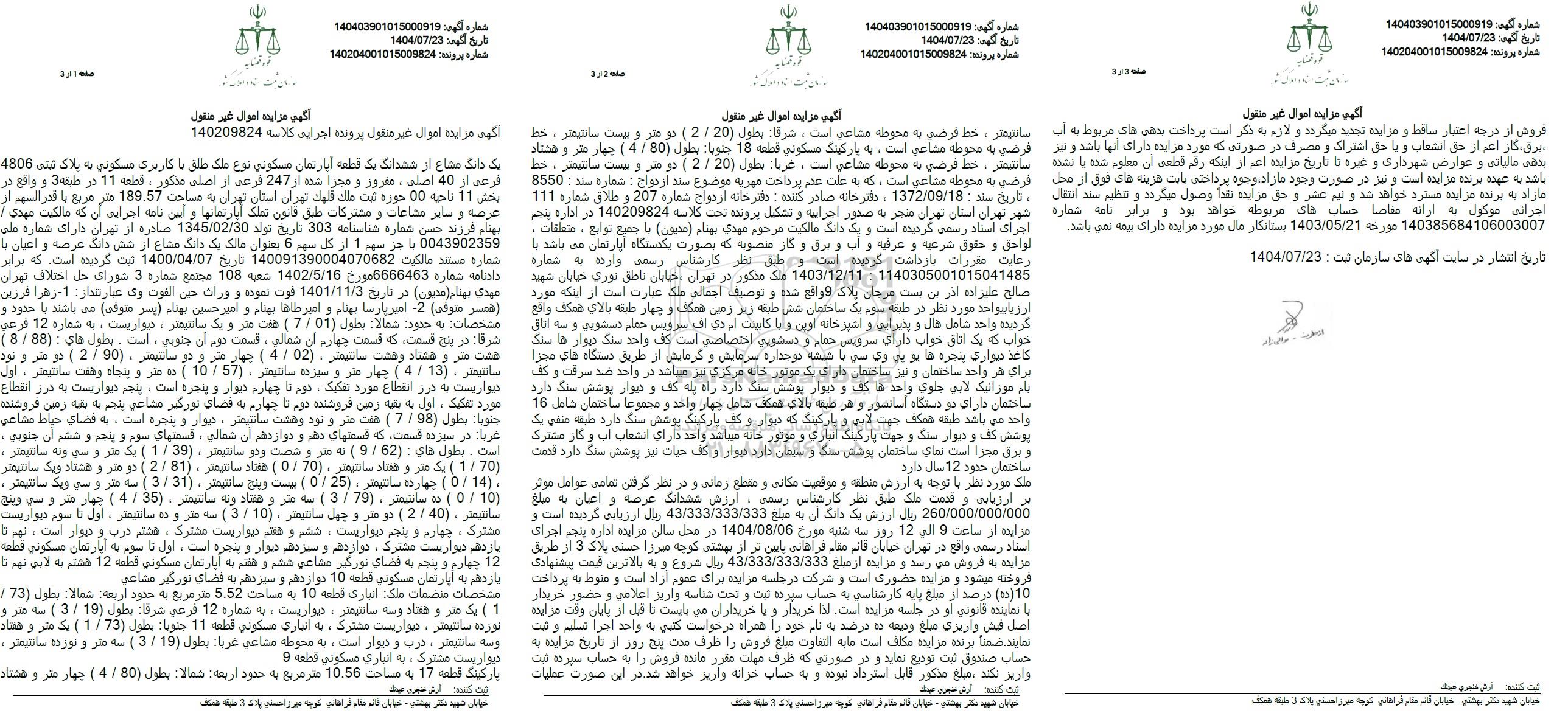 مزایده فروش یک دانگ مشاع از ششدانگ یک قطعه آپارتمان مسکونی به مساحت 189.57 مترمربع, مزایده فروش یک دانگ مشاع از ششدانگ یک قطعه آپارتمان مسکونی به مساحت 189.57 مترمربع
