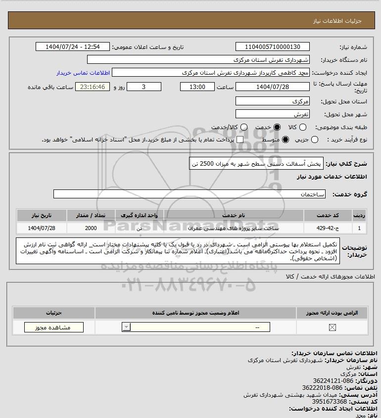 شرح کلی نیاز: پخش آسفالت دستی سطح شهر به میزان 2500 تن