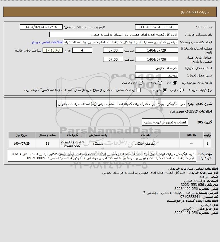 شرح کلی نیاز: خرید آبگرمکن دیواری ایران شرق برای کمیته امداد امام خمینی (ره) استان خراسان جنوبی