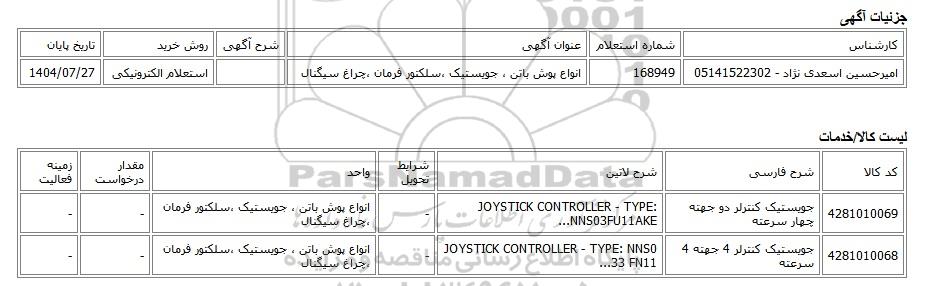 | امیرحسین اسعدی نژاد - 05141522302 | 168949 | انواع پوش باتن ، جویستیک ،سلکتور فرمان ،چراغ سیگنال | استعلام الکترونیکی | 1404/07/27 |
