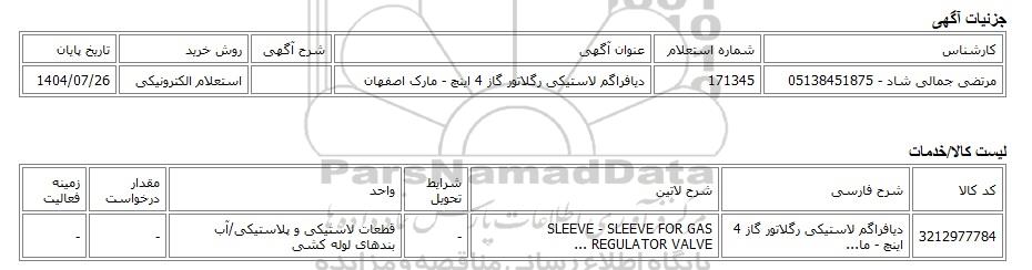| مرتضی جمالی شاد - 05138451875 | 171345 | دیافراگم لاستیکی رگلاتور گاز 4 اینچ - مارک اصفهان | استعلام الکترونیکی | 1404/07/26 |
