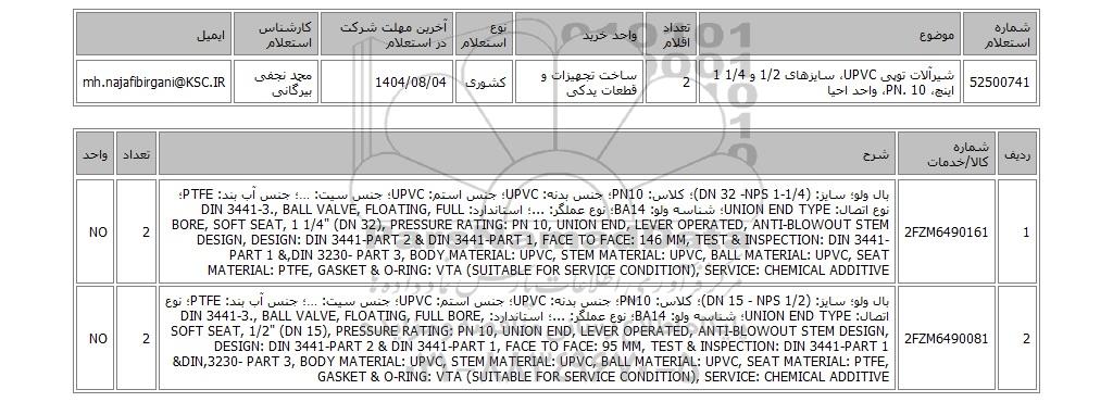| 52500741 | شیرآلات توپی UPVC، سایزهای 1/2 و 1/4 1 اینچ، PN. 10، واحد احیا | 2 | ساخت تجهیزات و قطعات یدکی | کشوری | 1404/08/04 | محمد نجفی بیرگانی | mh.najafibirgani@KSC.IR |