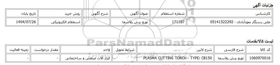 علی رستگار محمدآبادی - 05141522292 | 171187 | تورچ برش پلاسما | استعلام الکترونیکی | 1404/07/26 |