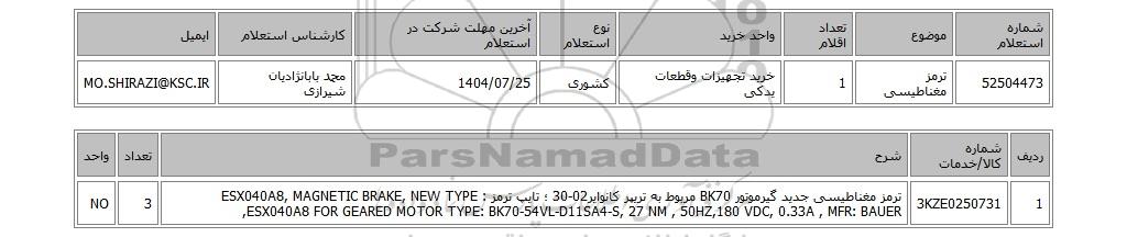 52504473 | ترمز مغناطیسی | 1 | خرید تجهیزات وقطعات یدکی | کشوری | 1404/07/25 | محمد بابانژادیان شیرازی | MO.SHIRAZI@KSC.IR |