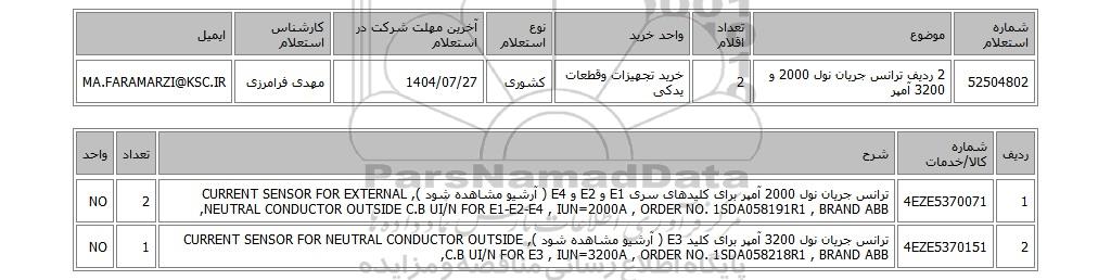 | 52504802 | 2 ردیف ترانس جریان نول 2000 و 3200 آمپر | 2 | خرید تجهیزات وقطعات یدکی | کشوری | 1404/07/27 | مهدی فرامرزی | MA.FARAMARZI@KSC.IR |