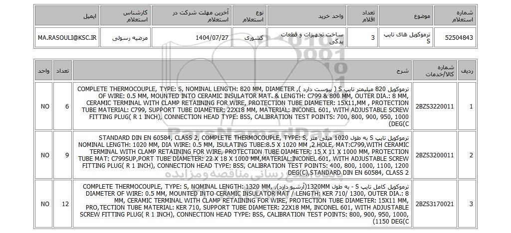 | 52504843 | ترموکوپل های تایپ S | 3 | ساخت تجهیزات و قطعات یدکی | کشوری | 1404/07/27 | مرضیه رسولی | MA.RASOULI@KSC.IR |