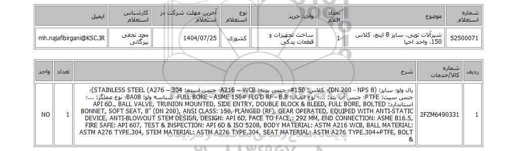 52500071 | شیرآلات توپی، سایز 8 اینچ، کلاس 150، واحد احیا | 1 | ساخت تجهیزات و قطعات یدکی | کشوری | 1404/07/25 | محمد نجفی بیرگانی | mh.najafibirgani@KSC.IR |