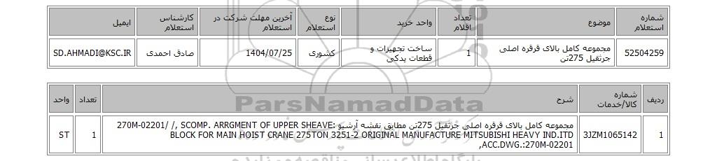 | 52504259 | مجموعه کامل بالای قرقره اصلی جرثقیل 275تن | 1 | ساخت تجهیزات و قطعات یدکی | کشوری | 1404/07/25 | صادق احمدی | SD.AHMADI@KSC.IR |