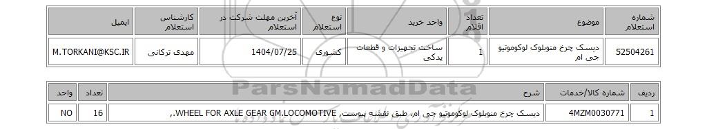استعلام دیسک چرخ منوبلوک لوکوموتیو جی ام, استعلام دیسک چرخ منوبلوک لوکوموتیو جی ام