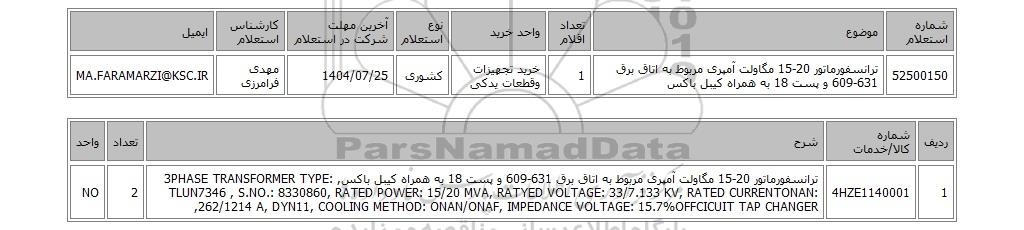 استعلام ترانسفورماتور 20-15 مگاولت آمپری مربوط به اتاق برق 631-609 و پست 18 به همراه کیبل باکس, استعلام ترانسفورماتور 20-15 مگاولت آمپری مربوط به اتاق برق 631-609 و پست 18 به همراه کیبل باکس