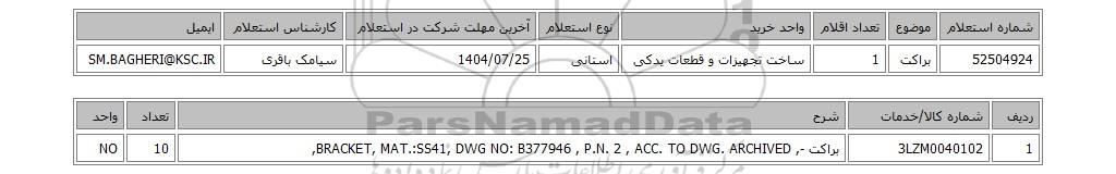 52504924براکت1ساخت تجهیزات و قطعات یدکیاستانی1404/07/25سیامک باقریSM.BAGHERI@KSC.IR