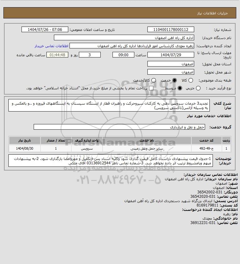 استعلام بها و موضوع استعلام استعلام تجدید3 خدمات سرویس دهی به کارکنان سیروحرکت و راهبران قطار از ایستگاه سیستان به ایستگاههای فیروزه و ..و بالعکس و به وسیله آژانس(تاکسی سرویس) به اطلاع کلیه شرکتها و افراد متخصص واجد شرایط میرساند، آگهی گذار در نظر دارد از طریق استعلام بها، نسبت به انتخاب و دریافت پیشنهادات اقدام نماید. این استعلام با کد آگهی ثبت شده در سامانه خبرگزاری پارس نماد : 9709486 منتشر شده است. مشخصات استعلام : تاریخ شروع استعلام: 1404/07/26 آخرین مهلت ارسال پیشنهاد قیمت : 1404/07/29 و محل اجرای پروژه : استان اصفهان میباشد. استعلام قیمت مورد درخواست : استعلام تجدید3 خدمات سرویس دهی به کارکنان سیروحرکت و راهبران قطار از ایستگاه سیستان به ایستگاههای فیروزه و ..و بالعکس و به وسیله آژانس(تاکسی سرویس) با دستهبندیهای تخصصی و گروه های مرتبط : ایاب و ذهاب, استعلام اطلاع رسانی میگردد.