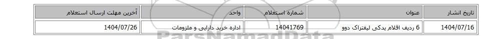 | 1404/07/16 | 6 ردیف اقلام یدکی لیفتراک دوو | 14041769 | اداره خرید دارایی و ملزومات | 1404/07/26 |