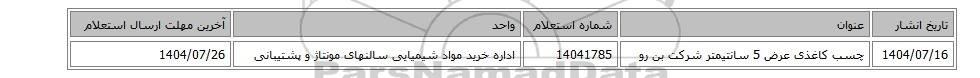 | 1404/07/16 | چسب کاغذی عرض 5 سانتیمتر شرکت بن رو | 14041785 | اداره خرید مواد شیمیایی سالنهای مونتاژ و پشتیبانی | 1404/07/26 |