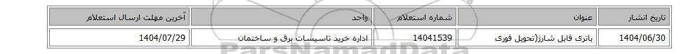 | 1404/06/30 | باتری قابل شارژ(تحویل فوری | 14041539 | اداره خرید تاسیسات برق و ساختمان | 1404/07/29 |