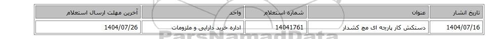 | 1404/07/16 | دستکش کار پارچه ای مچ کشدار | 14041761 | اداره خرید دارایی و ملزومات | 1404/07/26 |