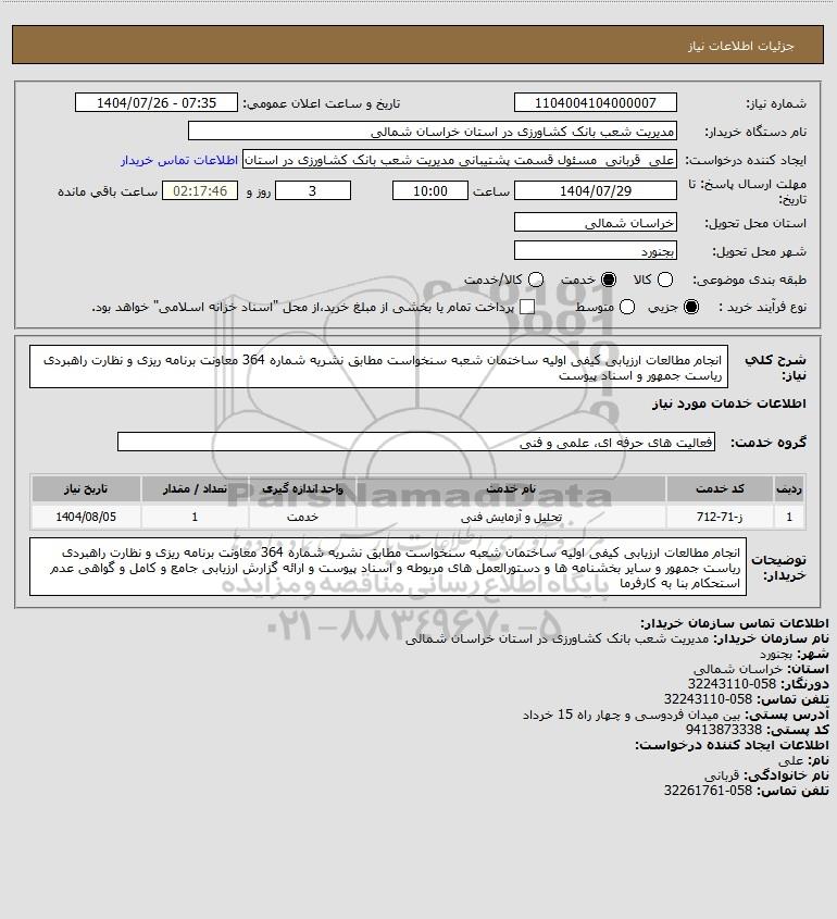 شرح کلی نیاز: انجام مطالعات ارزیابی کیفی اولیه ساختمان شعبه سنخواست مطابق نشریه شماره 364 معاونت برنامه ریزی و نظارت راهبردی ریاست جمهور و اسناد پیوست