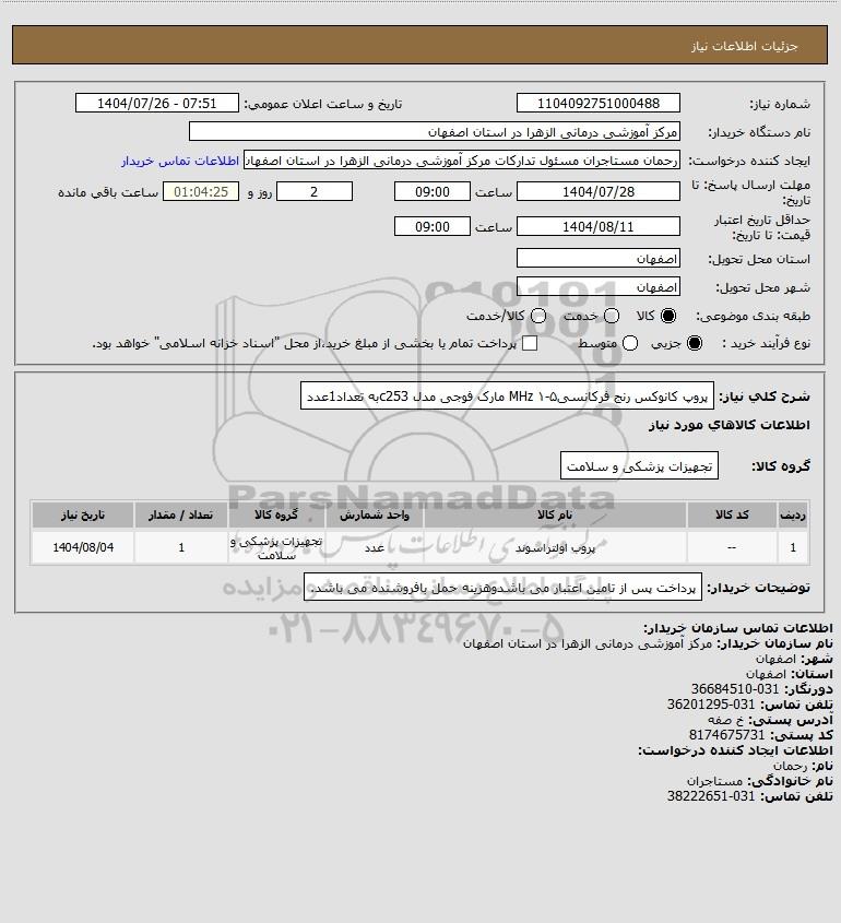 | 1 | -- | پروب اولتراسوند | عدد | تجهیزات پزشکی و سلامت | 1 | 1404/08/04 |