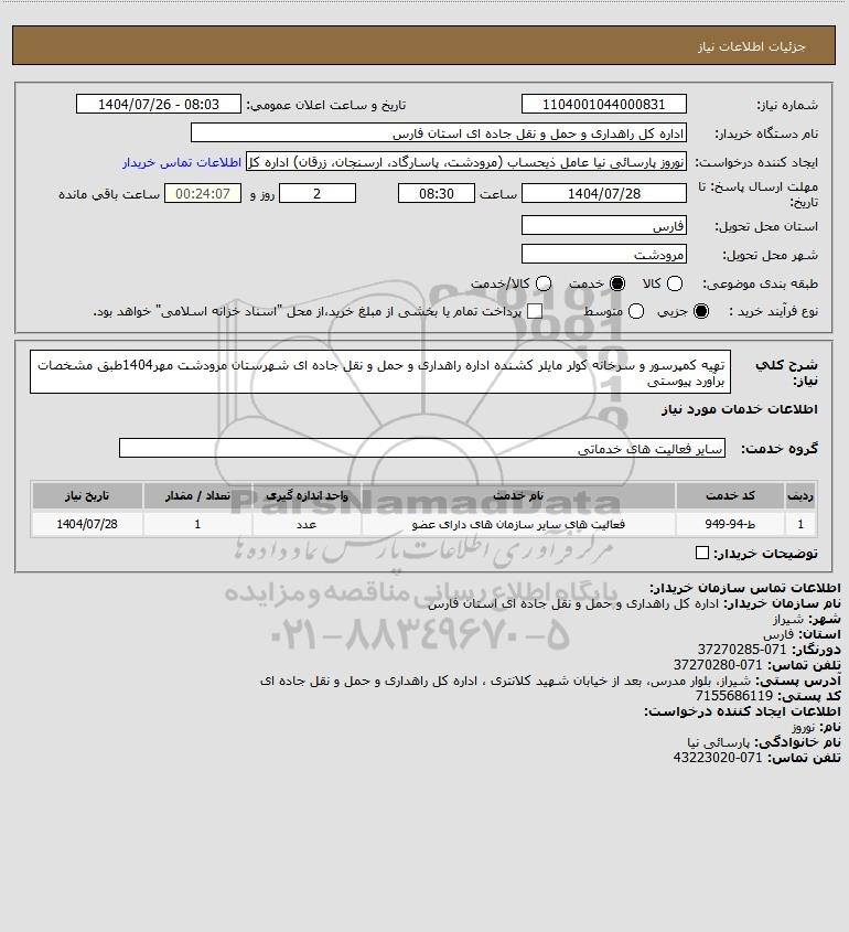 شرح کلی نیاز: تهیه کمپرسور و سرخانه کولر مایلر کشنده اداره راهداری و حمل و نقل جاده ای شهرستان مرودشت مهر1404طبق مشخصات برآورد پیوستی