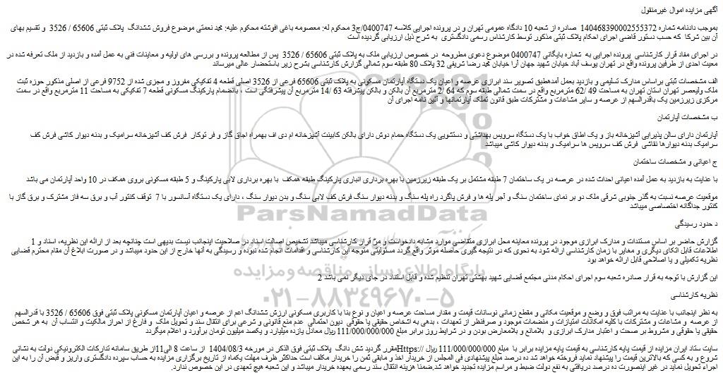 بموجب دادنامه شماره 140468390002555372  صادره از شعبه 10 دادگاه عمومی تهران و در پرونده اجرایی کلاسه 0400747/ج3 محکوم له: معصومه باغی افوشته محکوم علیه: محمد نعمتی موضوع فروش ششدانگ  پلاک ثبتی 65606 / 3526  و تقسیم بهای آن بین شرکا  که حسب دستور قاضی اجرای احکام پلاک ثبتی مذکور توسط کارشناس رسمی دادگستری  به شرح ذیل ارزیابی گردیده است